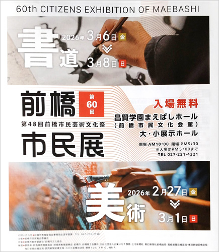 会期:2026年2月27日(金)〜3月1日(日) 時間:10:00〜17:30(入場は17:00まで) 会場:昌賢学園まえばしホール(前橋市民文化会館)1階 大・小展示ホール 住所:群馬県前橋市南町3-62-1 URL:前橋市|第60回前橋市民展覧会を開催します 卒業生X Instagram