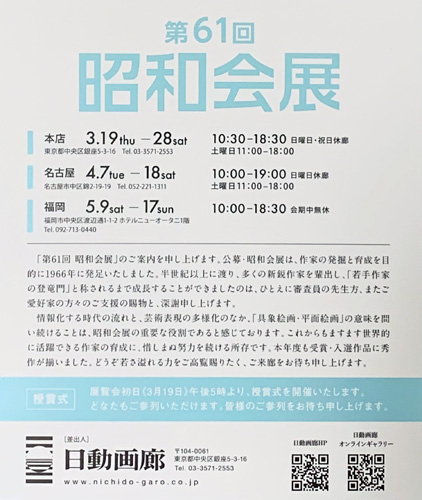 会期:2026年3月19日(木)~3月28日(土)※日曜・祝日休廊 時間:10:30~18:30 (土曜日は11:00~18:00) 会場:日動画廊本店 住所:東京都中央区銀座5-3-16 URL:昭和会展Webサイト