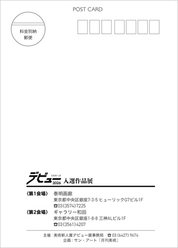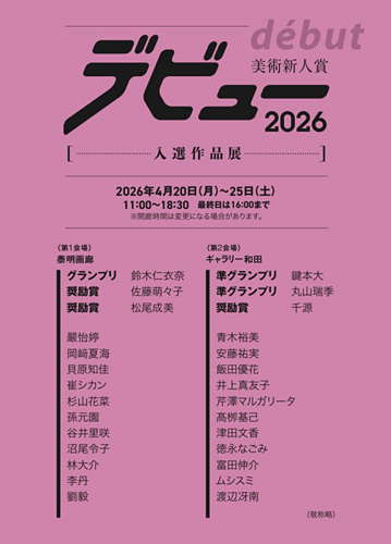 会期:2026年4月20日(月)~4月25日(土) 時間:11:00〜18:30 ※最終日は16:00まで 会場:第1会場 泰明画廊 第2会場 ギャラリー和田 住所:第1会場 中央区銀座7-3-5 ヒューリックG7ビル1F 第2会場 中央区銀座1-8-8 三神ALビル1F URL:月刊美術「美術新人賞デビュー2026 審査総評&全入選作28作家 一挙紹介!」