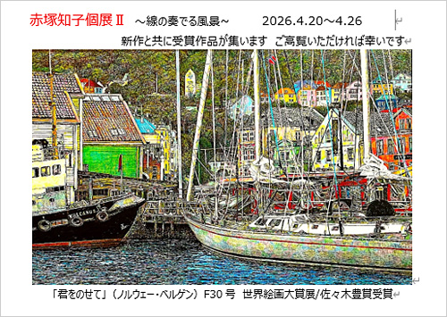 赤塚知子さん(2009年度通信教育課程油絵学科絵画コース卒業)による展覧会「赤塚知子個展II~線の奏でる風景~」のお知らせ。